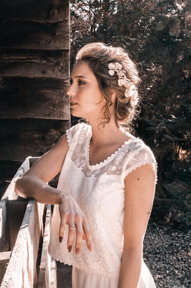 Si vous désirez mettre des fleurs naturelles dans vos cheveux, je vous déconseille de commander un bijoux chez votre fleuriste car celui-ci ne saura pas quelle taille et forme j’ai besoin précisément. Mieux vaut lui demander un petit bouquet de minimum 3 styles de fleurs différentes (pas plus grosses qu’une pièce de 2€) et je réaliserai moi-même votre bijou de cheveux après votre coiffure.